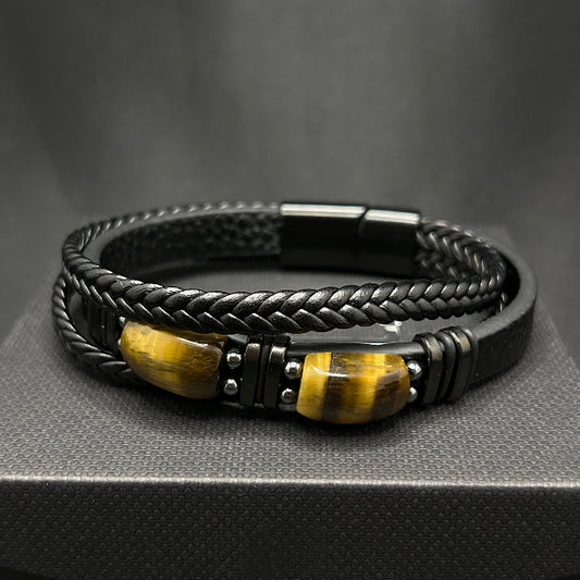 Leather Bracelet Tiger Eye Stone Inlaid Double Layer Black